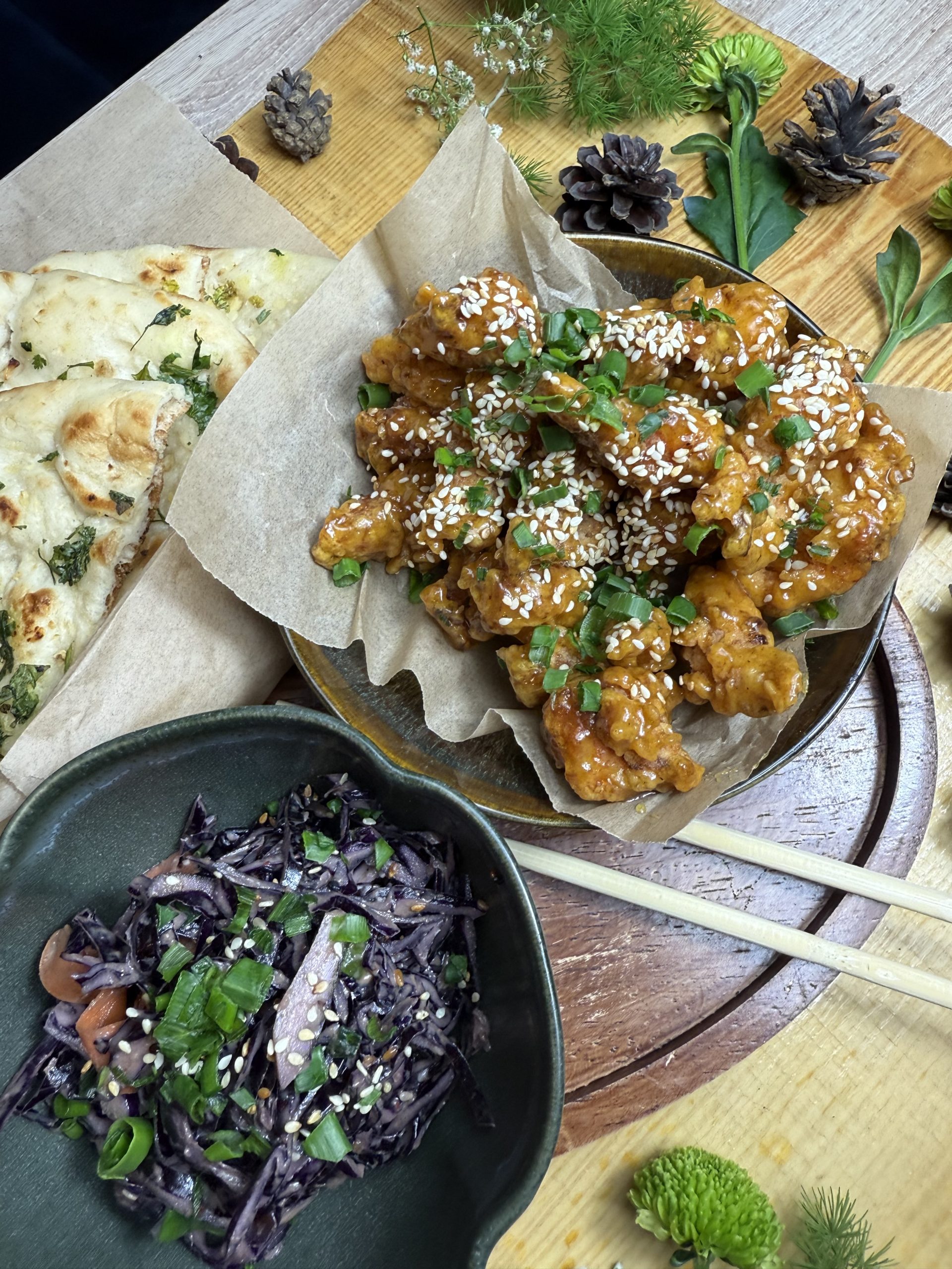 kurczak w panierce, sól, pieprz, sok z cytryny, oliwa z oliwek, musztarda, sezam, szczypiorek, surówka z modrej kapusty, ryż ( do wyboru chlebek naan + 6zł, daj znać w adnotacjach)cena zawiera opakowanie