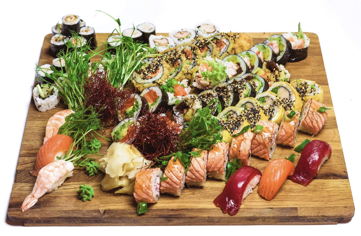 sake futomaki 6szt, ebi futomaki 6szt, ika ten 6szt, date ibodai 6szt, sake tempura 6szt, grill maguro 8szt, california gold 8szt, ibodai maki 6szt, unagi maki 6szt, ebi nigiri 2szt, sake nigiri 2szt, maguro nigiri 2szt