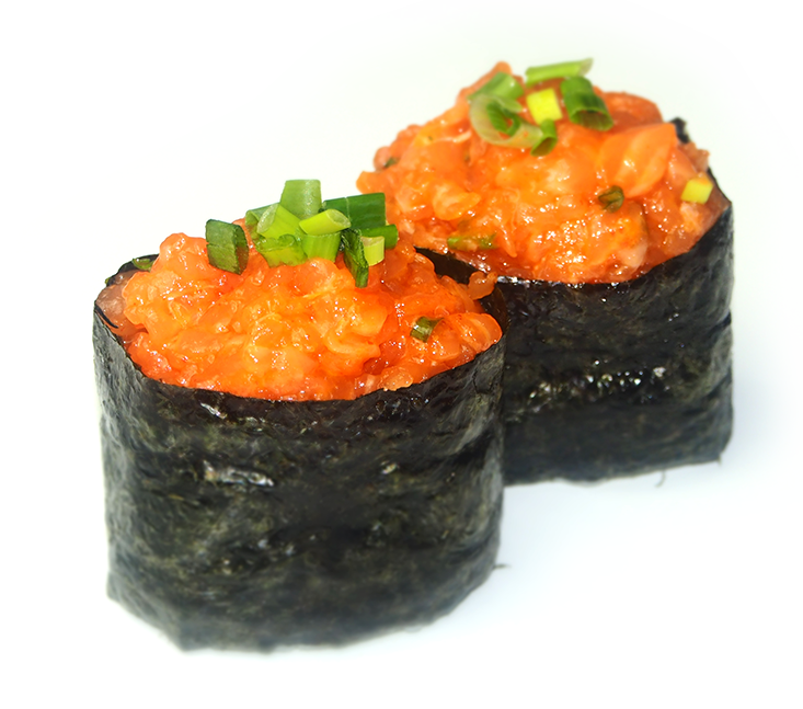 tatar z łososia, szczypiorek, sansho, ikra z ryby latającej, sos sojowy, ryż, nori| porcja to 4 kawałki